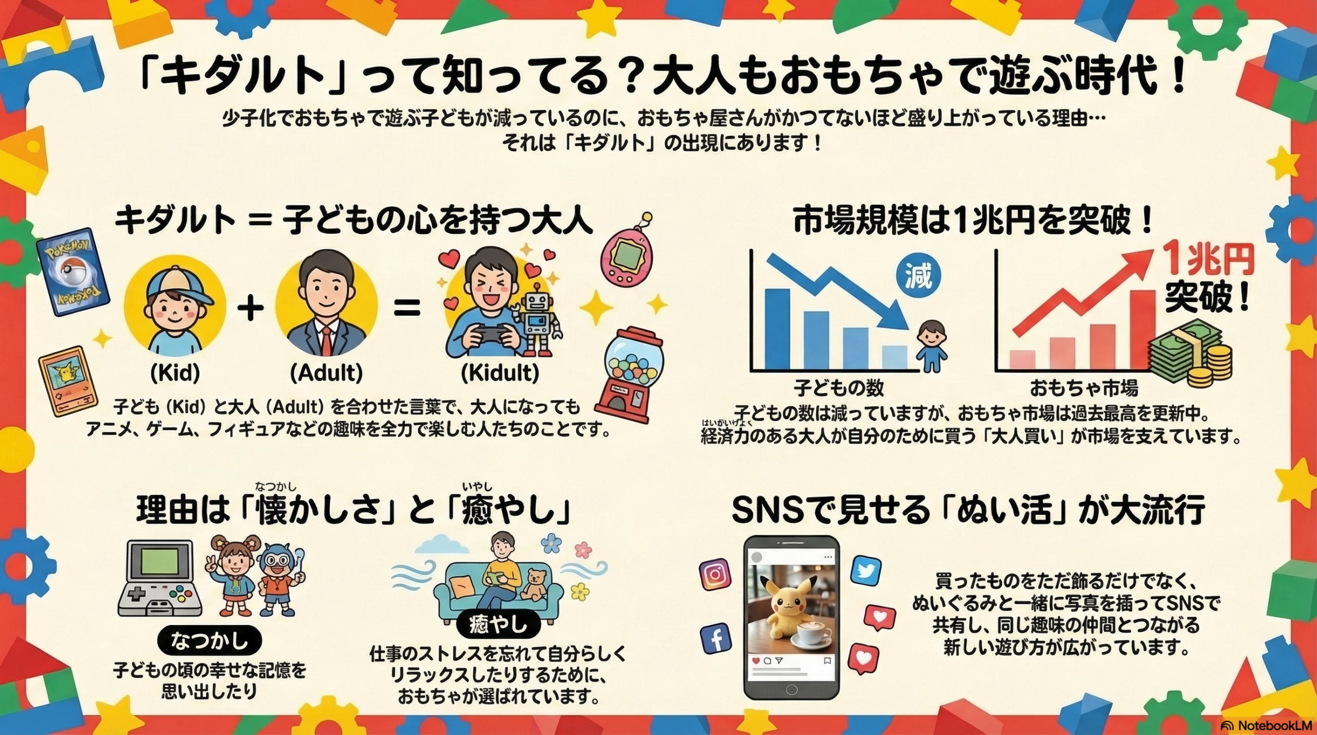 実は今、子どもの数は減り続けているにもかかわらず、国内の玩具市場規模は1兆円を突破し、過去最高を更新し続けているんです。世界的に見ても玩具業界の売上は7%増と見事な復活を遂げています。この奇妙な逆転現象を支えているのが、「キダルト(Kidult=Kid+Adult)」と呼ばれる、子ども時代の遊び心を持ち続ける大人たちです。