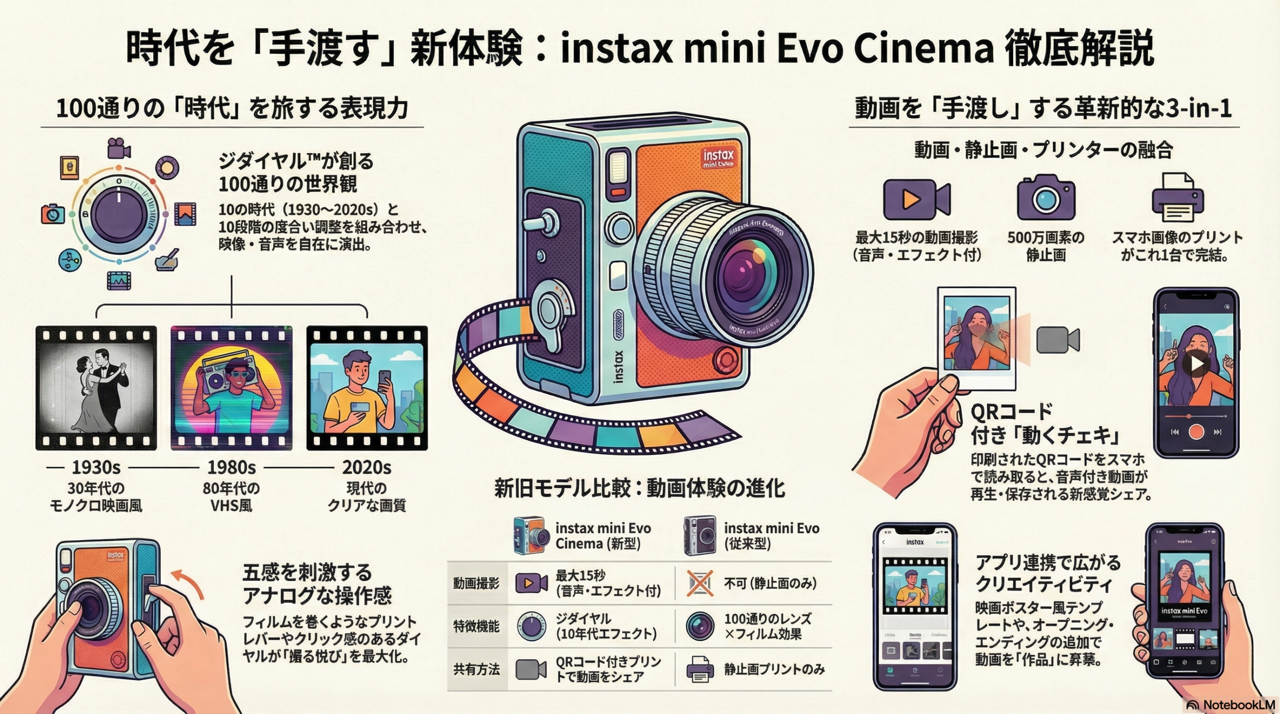 ズバリ、「初対面の人とのアイスブレイク&最強のオフライン名刺」として使いますね。飲み会やイベントで、あえて1980年代の少しダサいエフェクトで動画を撮り、その場でQRコード付きのチェキを出力して手渡す[15, 20]。これだけで絶対に会話が弾みますし、相手の記憶に深く刻まれること間違いなしです。