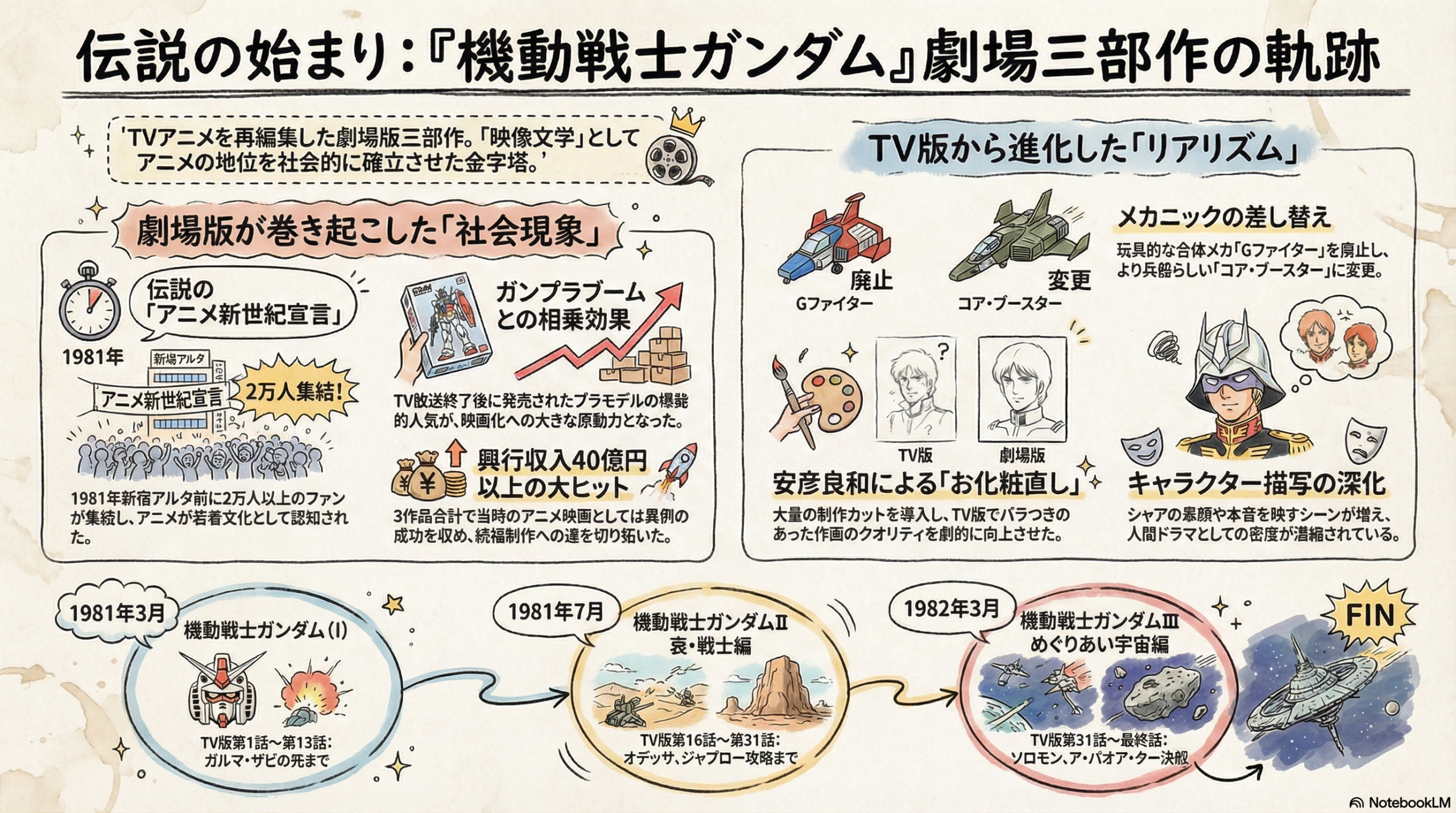 1981年の「アニメ新世紀宣言」。公式1万5千人、実数2万人以上の若者が新宿に集結したこの日、アニメは「子供の娯楽」から「若者の文化」へと脱皮しました。寝不足の制作スタッフが総出でポスターを巻き、ヒューマンチェーンを作って監督を護送したというこの熱量。この決定的瞬間がなければ、今日のガンダムブランドは影も形もなかったでしょう。